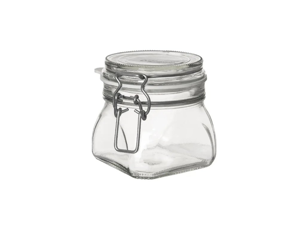 Dóza skleněná patentní s klasickým silikonovým těsněním a drátěným uzávěrem. Rozměry: objem 0,5 l, 10x10x10 cm. Skleněnou část lze mýt v myčce.