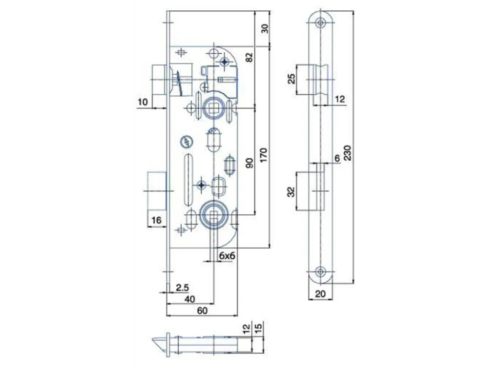 Zadlabací mezipokojový zámek WC 01-16 jednozápadový bez převodu s otvory pro dělené štíty je univerzální na pravé i levé dveře.