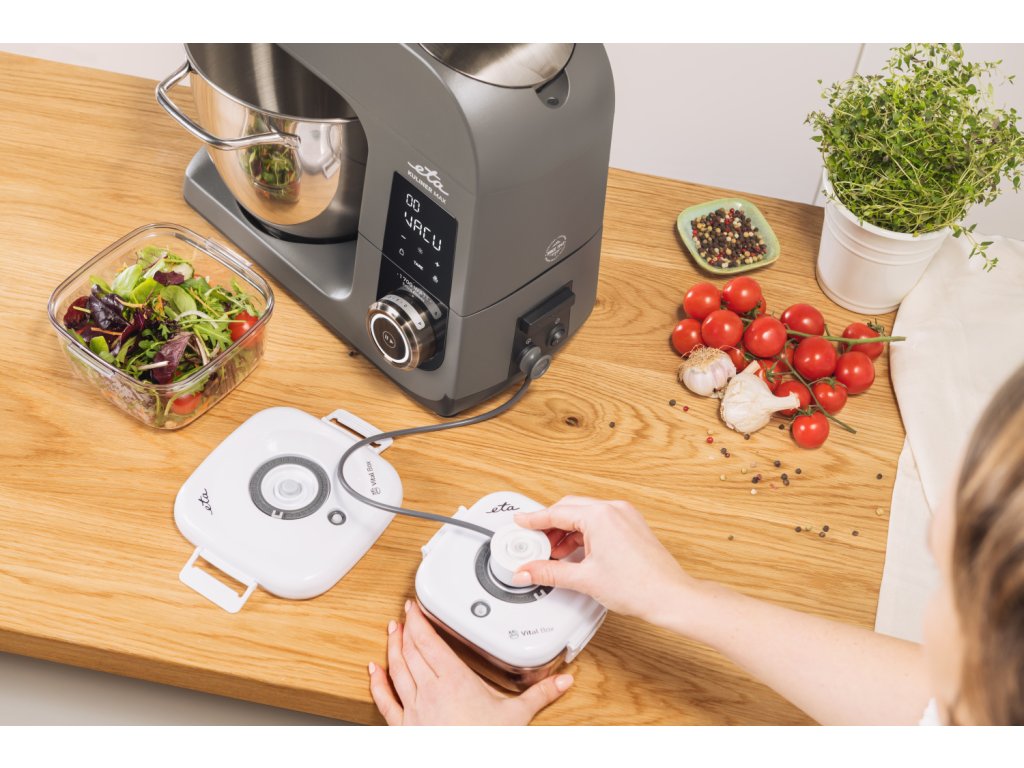 Kuchyňský robot ETA Kuliner II Max je expertem na vakuování – nepotřebuje žádnou externí vakuovačku a zvládne vše sám! Vakuovací hadičku spolu s boxem nebo sáčkem připojíte přímo k robotu a na dotykovém panelu zvolíte vakuování.