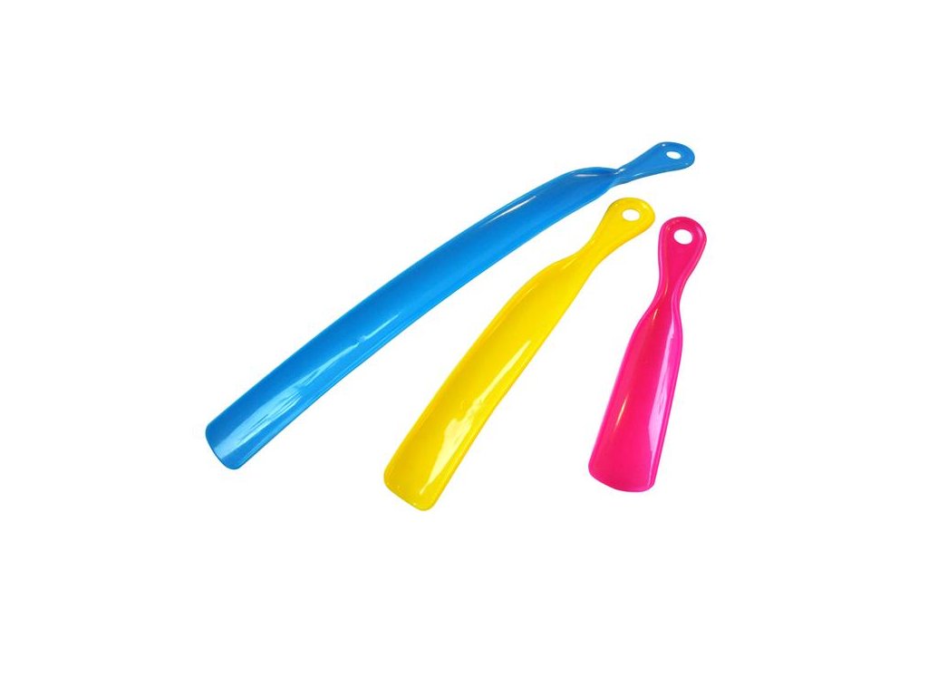 Sada plastových lžic na boty. Lžíce na boty usnadní obouvání bot. V setu jsou 3 ks - žlutá, modrá a růžová lžíce různých velikostí - 18,5/25,5/39 cm.