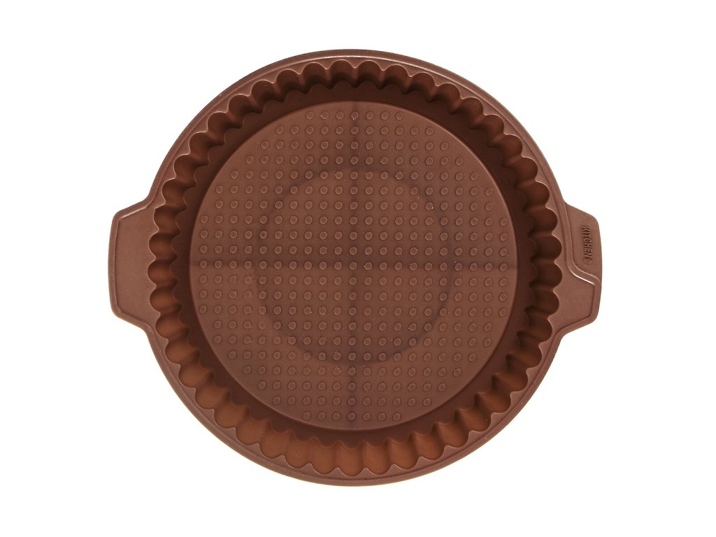 Hnědá silikonová forma o průměru 27 cm, s antiadhézním povrchem, pro přípravu dozlatova vypečeného nadýchaného korpusu, který má zvýšený okraj a po otočení lze vnitřek plnit tvarohem, ovocem zalitým želatinou nebo jinou oblíbenou náplní. Navíc má zpevněné dno, aby byl korpus rovný.
