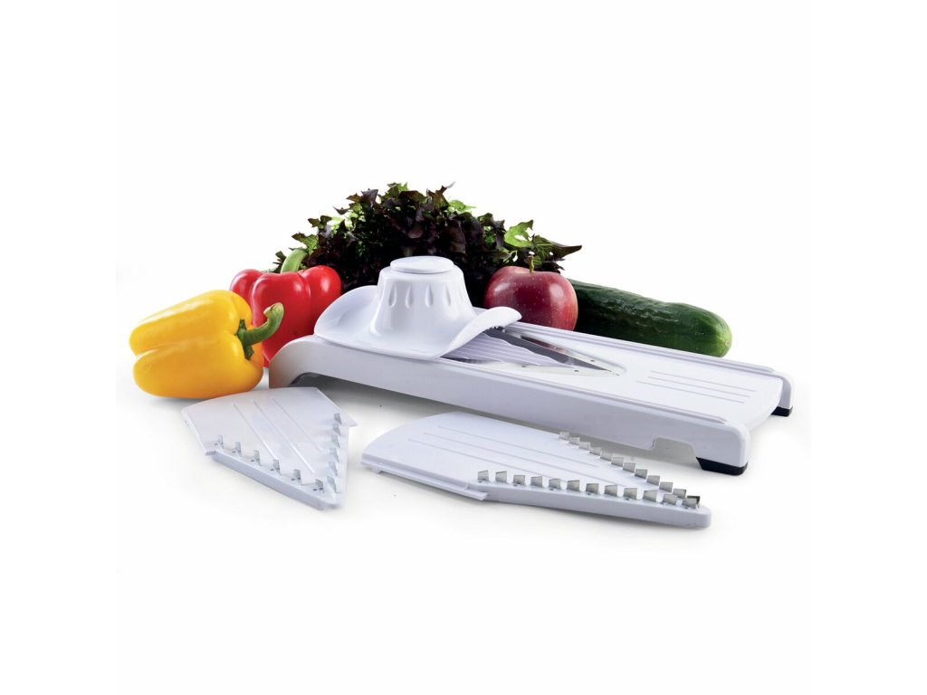 Je opatřeno výměnnými struhadly, které umožňují plátkování, strouhání úzkých i širších kusů zeleniny - např. oblíbených hranolků. Výměnné části jsou opatřené ostrými nerezovými břity. Součástí je vodící rukojeť pro ochranu prstů, pomocí které potravinu, např. cibuli, krájíte, aniž byste se zranili.