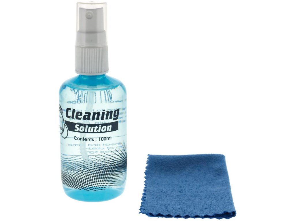 Balení obsahuje: čistící roztok, utěrku z mikrovlákna
