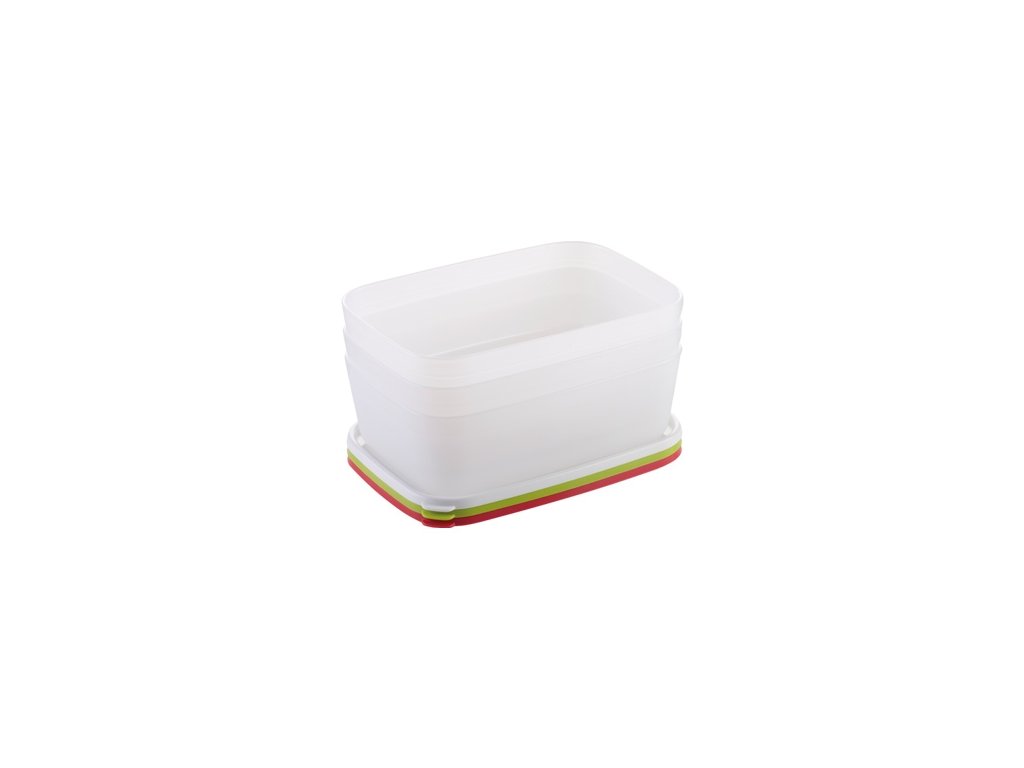 Vyrobeno ze špičkového plastového materiálu určeného pro zdravotnictví a farmacii, vynikající pro hygienické uložení potravin v mrazničce nebo ledničce. Použitý materiál je neutrální, neovlivňuje kvalitu pokrmů ani při dlouhodobém zmražení a skladování. Dózy jsou elastické, snadno se otevírají i zavírají a dokonale těsní. Opatřeno barevnými víčky pro snadné rozlišení při odděleném skladování masa, zeleniny, ovoce apod., stohovatelné na sebe i do sebe pro úsporu místa. Vhodné do mrazničky, ledničky, mikrovlnné trouby a do myčky. 3 roky záruka.