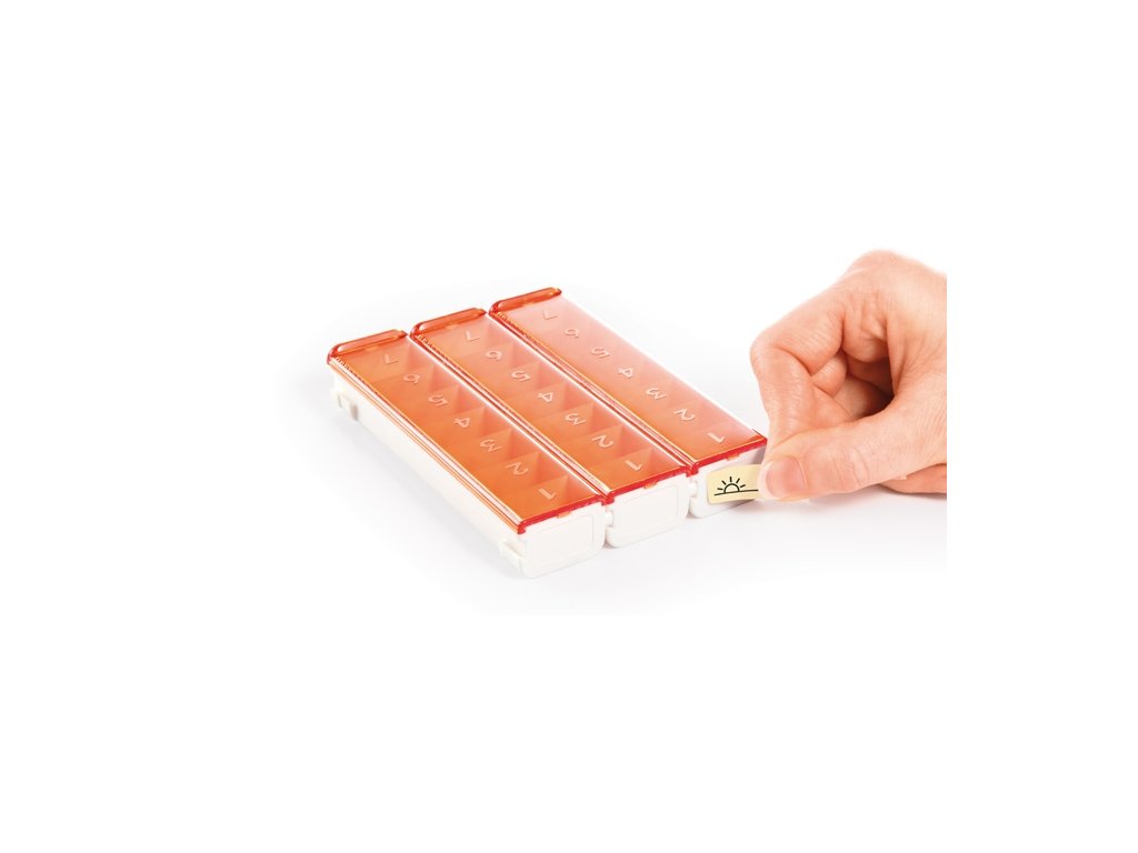 Vynikající pro přehledné uložení léků na týden a jejich pravidelné dávkování v určenou denní dobu. Se samolepicími štítky pro označení čtyř fází dne (ráno, poledne, večer a noc). Pro přehledné dávkování v různých denních časech lze snadno spojit do řady s více dávkovači na léky PRESTO. Vyroben z odolného plastu. 3 roky záruka.