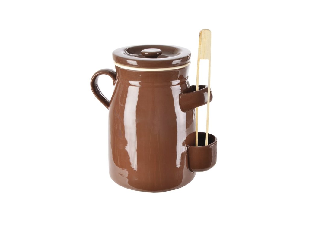 Hrnec kyseláč najde všestranné uplatnění ve Vaší kuchyni. Slouží zejména k přípravě doma nakládaných pokrmů, jako jsou kvašáky, utopenci, ryby, sýry a další lahůdky nakládané do oleje nebo octového nálevu. Hrnec je vyroben z užitkové glazované keramiky, která nepropouští světlo, udržuje stálou teplotu a potraviny pak získají lepší podmínky pro dozrání a správnou chuť. Součástí hrnce je keramická poklička a dřevěné kleště na vyjímání uložených potravin. Hrnec má 2 boční ucha a kapsu na zachycení odkapávající tekutiny z kleští. Rozměry: objem 2,5 l, pr. 15 cm, v. 21,5 cm.