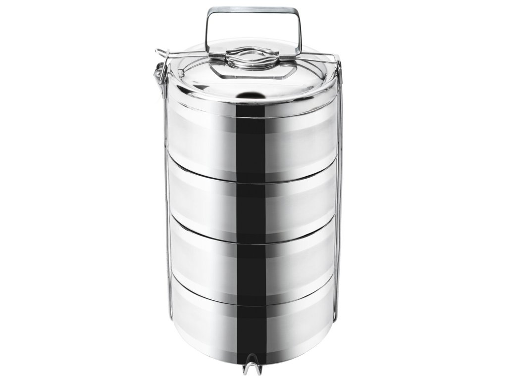 Termojídlonosič pro přenášení pokrmů dlouho zachová jejich teplotu. Součástí je kovový stojan, opatřený přezkou, která zajistí jeho pevné uzavření a vrchní poklice. Materiál: nerez. 4 patra. Rozměry: objem 4x 1,1 l, pr. 16 cm, celk. výška 36 cm.