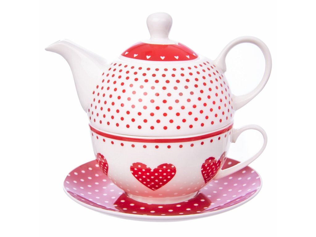 Čajová souprava se skládá z hrnečku s podšálkem a konvičky, které se skládají do sebe. Materiál: porcelán. Vhodná do myčky i MVT. Dekor puntík a srdce. Rozměry: celková výška 14 cm, hrneček - pr. 11 cm, v. 5,7 cm, objem 0,34 l, konvička - pr. 11 cm, v. 10 cm, objem 0,38 l.