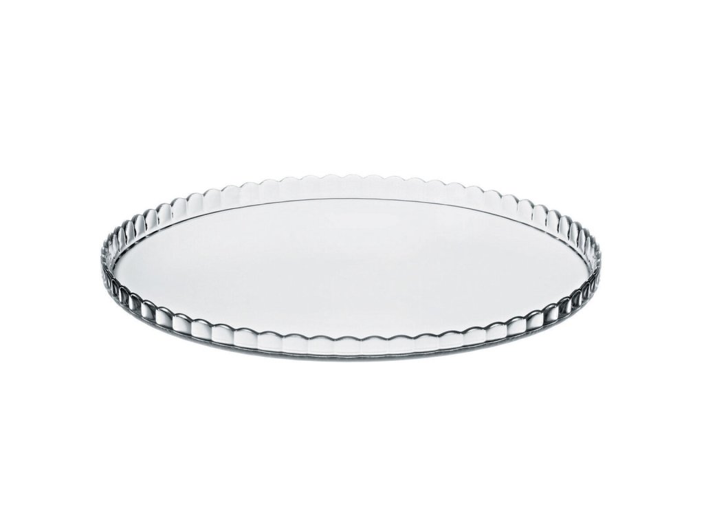 Podnos kulatý s vroubkovaným okrajem. Krásně na něm naservírujete dort, koláč, zákusky, jednohubky, chlebíčky,.... Materiál: sklo. Vhodný do myčky na nádobí i do ledničky. Rozměry: pr. 32 cm, v. 1,5 cm.