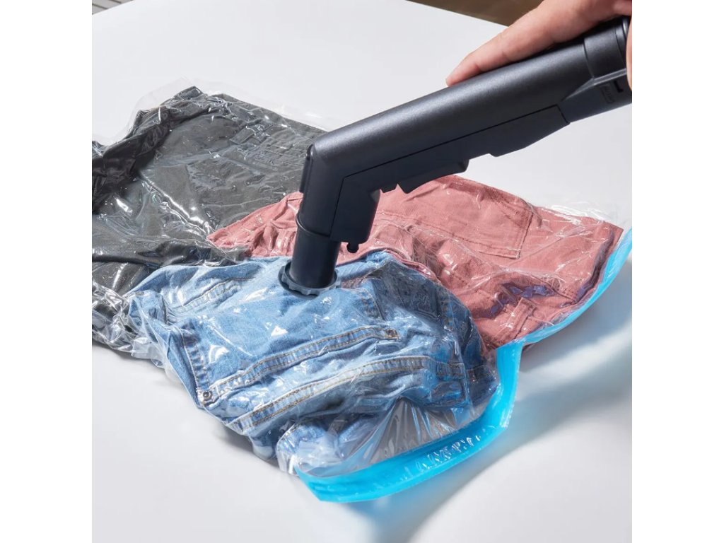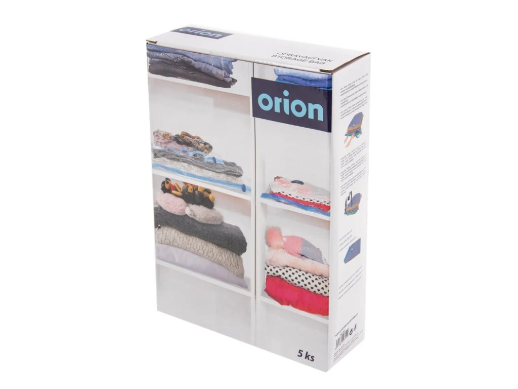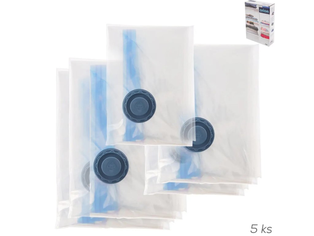 Sada 5 odsávacích vaků je vhodná pro uskladnění sezónních oděvů, lůžkovin, textilních i plyšových hraček. Po odsátí vzduchu z vaku pomocí vysavače nebo pumpičky na odsávání vaku se objem vaku výrazně zmenší a Vy ušetříte místo na ukládání. Oděvy zároveň chráníte před roztoči, moly i prachem. Materiál: plast (PA+PE). Rozměry: 1 ks 70x50 cm, 2 ks 90x55 cm, 2 ks 130x80 cm.