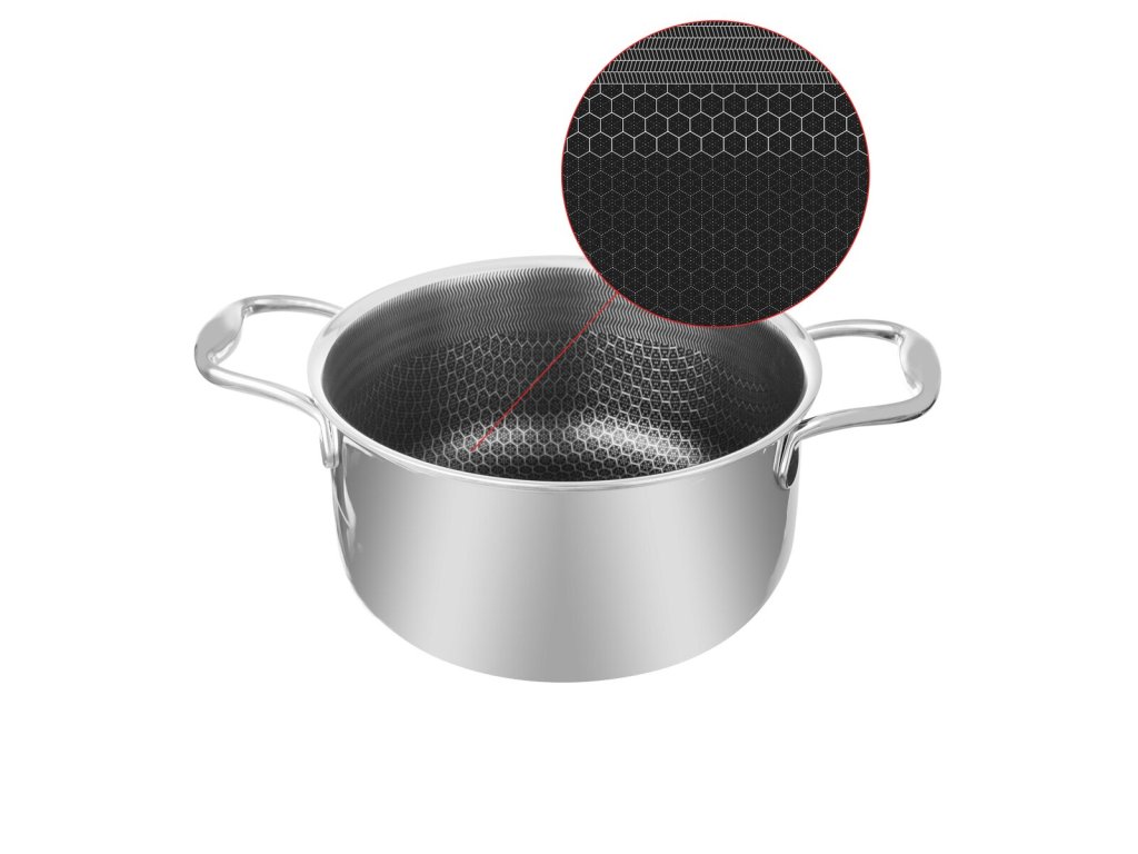 Unikátní hrnec z řady nádobí COOKCELL HYBRID kombinuje nepřilnavý povrch a nerezovou ocel. Vzhledem k tomu, že nádobí má mnoho bodů, které mají vrstvu povrchu navíc, má větší tepelnou konzervaci a vyšší přenos tepla než obvyklé nádobí. Je to nádobí s nepřilnavým povrchem, které Vám poskytne snadnější čistění ve srovnání s ostatním nádobím z nerezové oceli. Na povrch můžete použít i kovové nástroje, zůstane nepoškozený. Možnost zavěšení. Je vhodný na všechny typy spotřebičů, do trouby do max. teploty 260 °C, vhodný do myčky na nádobí. Materiál: 3vrstvé nádobí - vnitřní kvalitní nerez s nepřilnavým povrchem, hliník, vnější nerezová vrstva. Rozměry: objem 4,8 l, pr. 24 cm, v. 11,5 cm.