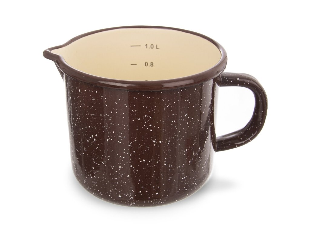 Hrnek smaltovaný s hubičkou a vnitřní odměrkou, vhodný na všechny typy spotřebičů. Vhodný do myčky nádobí. Rozměr: vnitřní pr. 12 cm, v. 11 cm, objem 1,2 l.
